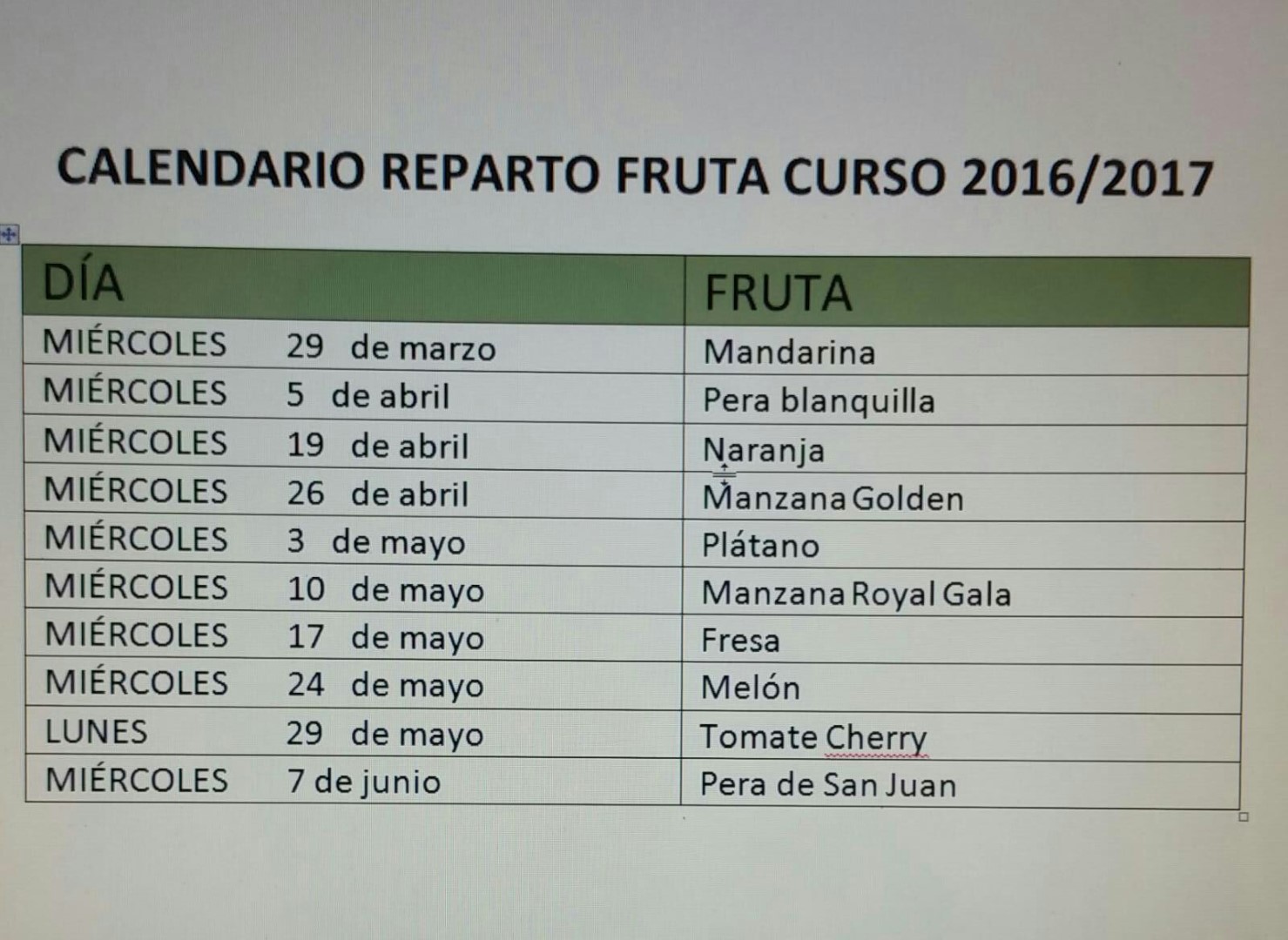 Con el fin de que podáis organizaros y valorar si queréis echarle algo más de almuerzo ese día o sencillamente sustituirlo (no es aconsejable si queremos conseguir mejorar los hábitos saludables de los niños/as) os adjuntamos el cuadrante con la fruta que nos entregarán cada MIÉRCOLES.