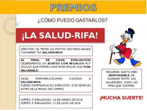 Con el fin de seguir potenciando la herramienta, que tan buenos resultados nos está dando, hemos decidido hacer una rifa en el colegio, al finalizar cada evaluación. Lo particular de esta rifa es que solamente se podrán adquirir participaciones a través de los saludeuros que va ganando semanalmente el alumnado.
