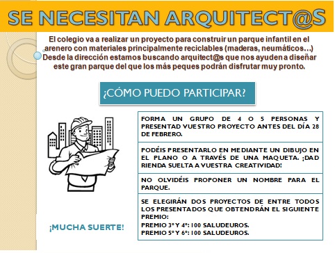Durante estos días, en el Colegio estamos recibiendo los trabajos y maquetas correspondientes al Concurso «Se Buscan Arquitectos» que planteamos al alumnado con la finalidad de aportarnos ideas para cambiar el arenero dentro del Programa «Mejoras de los Patios de Recreo«.