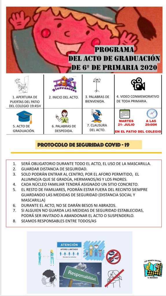 El próximo martes 21 de julio de 2020 a las 20.00 horas realizaremos en el Colegio el Acto de Graduación para el alumnado de 6º de Primaria.