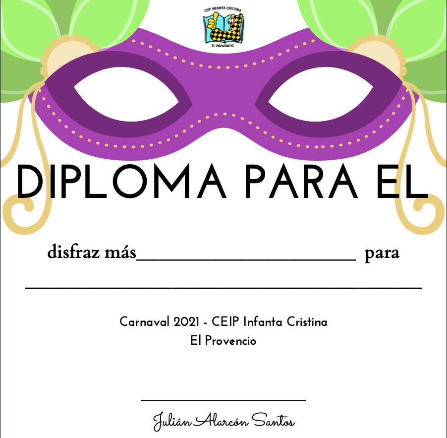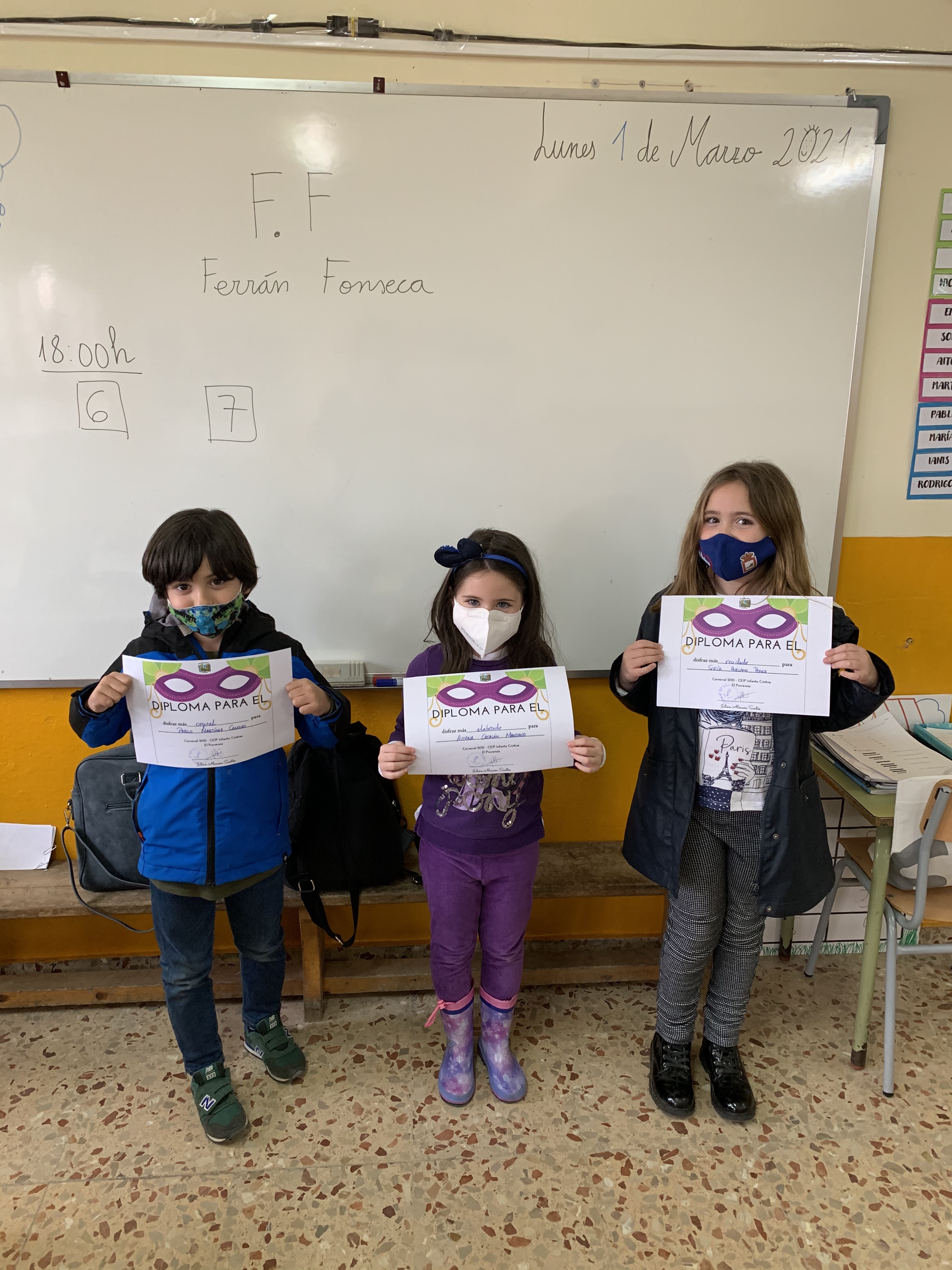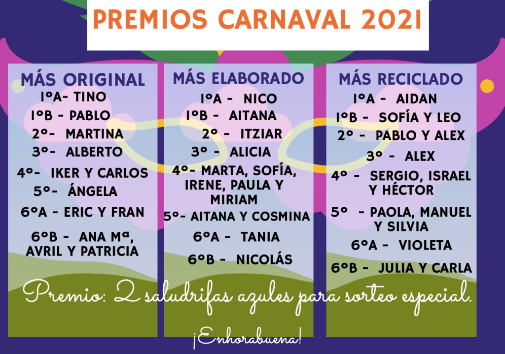 Como este año 2021 no hemos podido realizar nuestro característico desfile carnavalesco por las diferentes calles de la localidad, hicimos un desfile interno y para motivar más aún a nuestros alumnos/as, planteamos en PRIMARIA el «concurso carnaval 2021» (totalmente voluntario) donde los maestros/as valorábamos los disfraces atendiendo a tres categorías: