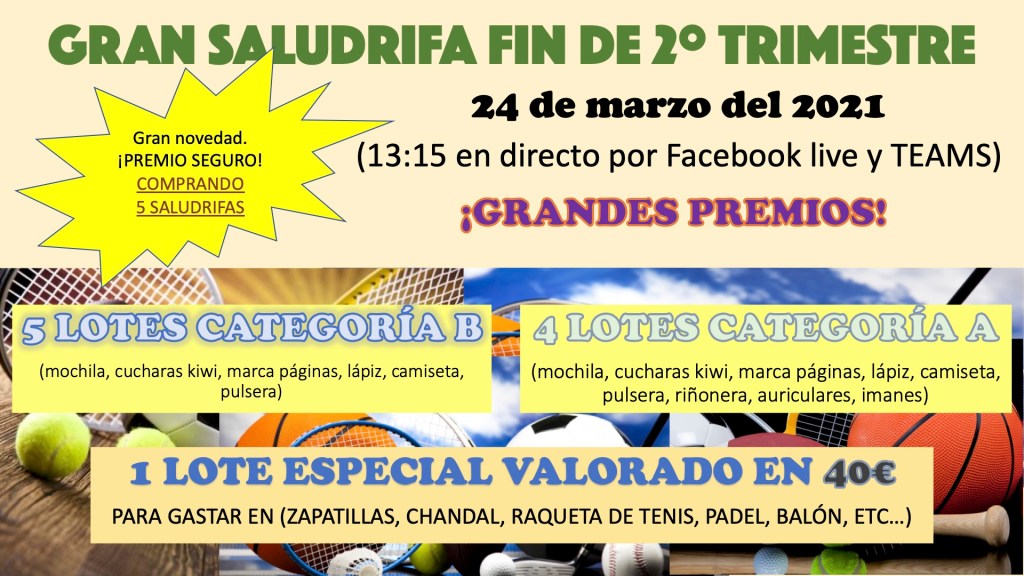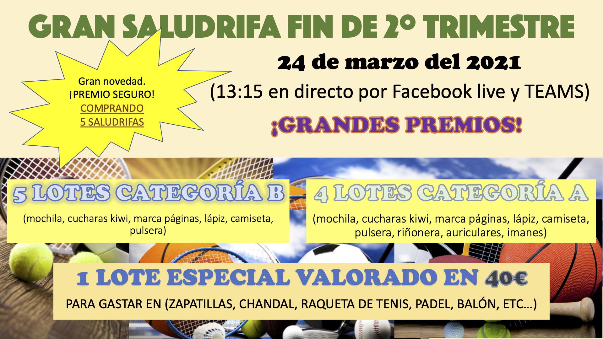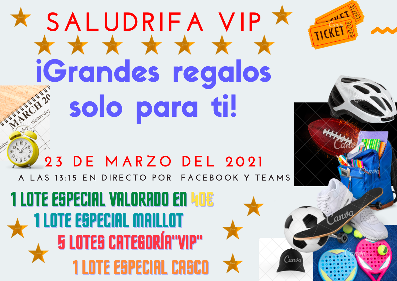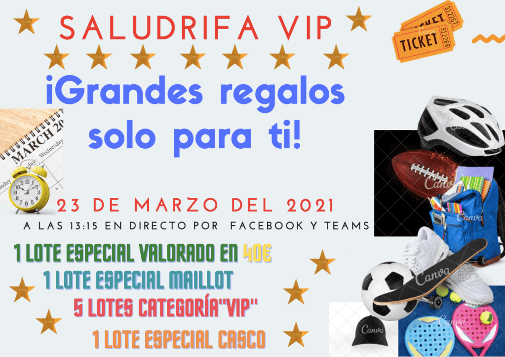 Por un lado, celebraremos una «saludrifa VIP» con rifas que no se pueden comprar y solamente se pueden conseguir con «trabajos» en el colegio como por ejemplo: locutor de radio, patrulla de reciclaje o ayudante de huerto, y también, habiendo sido los ganadores de los diferentes concursos que con el fin de motivar a nuestros alumnos/as planteamos continuamente. Habrá bastantes lotes de regalos y un premio especial.