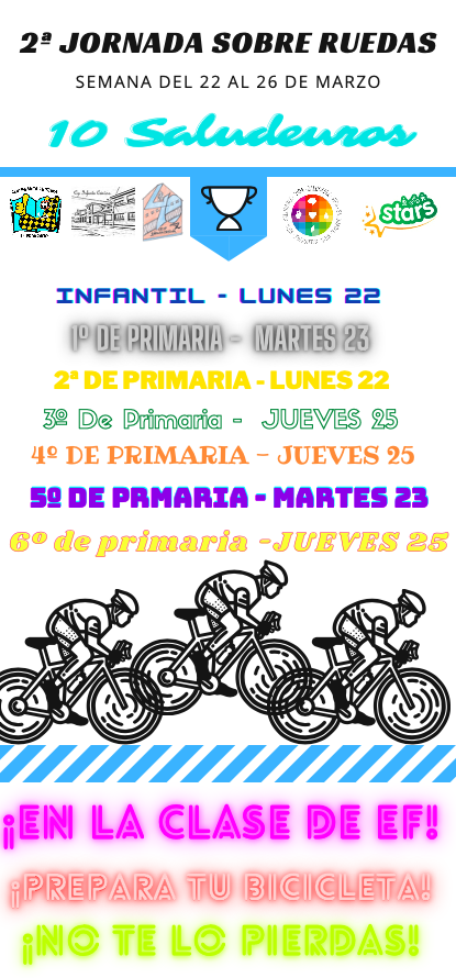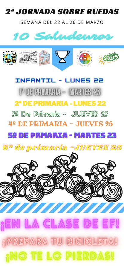 Gran participación del alumnado de todo el centro en la jornada sobre ruedas del 2º trimestre. Se hicieron actividades diversas desde infantil hasta 6º de primaria, tanto dentro del centro como por la localidad, aprendiendo a circular por las calles del pueblo, rotondas, aprendizaje de señales… con la colaboración de Kike, vigilante municipal de El Provencio.