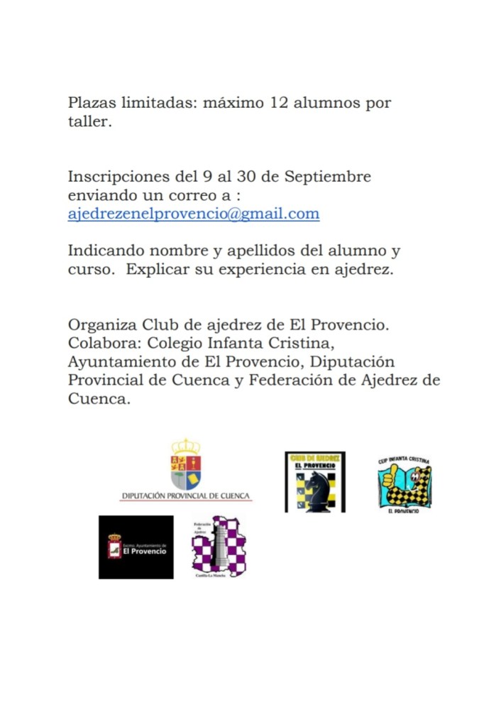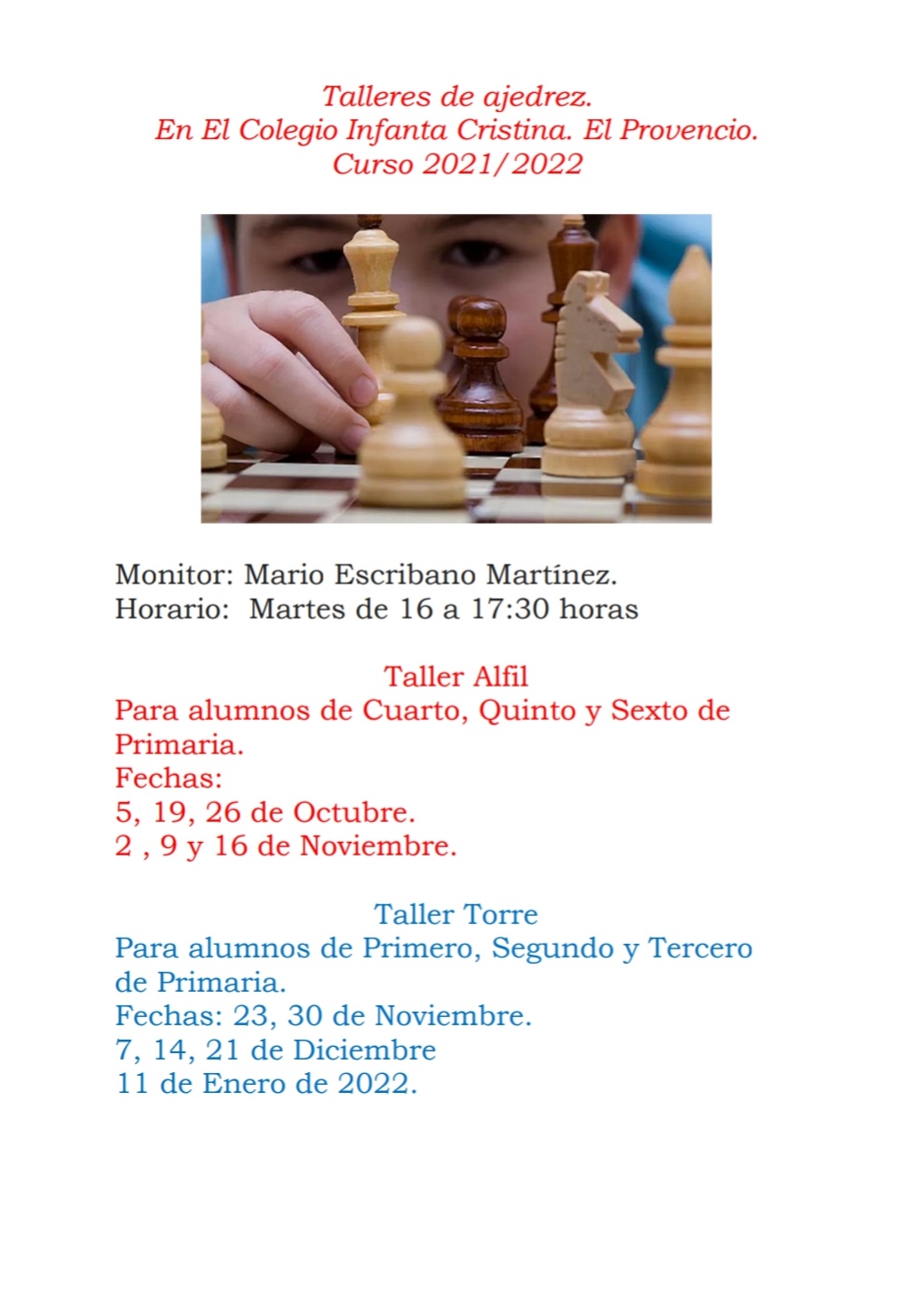 Estará destinado al alumnado de Primaria durante los martes de octubre a enero en horario de tarde, consistiendo en la Iniciación al ajedrez a través de un método novedoso y didáctico de la Escuela Europea de Ajedrez.