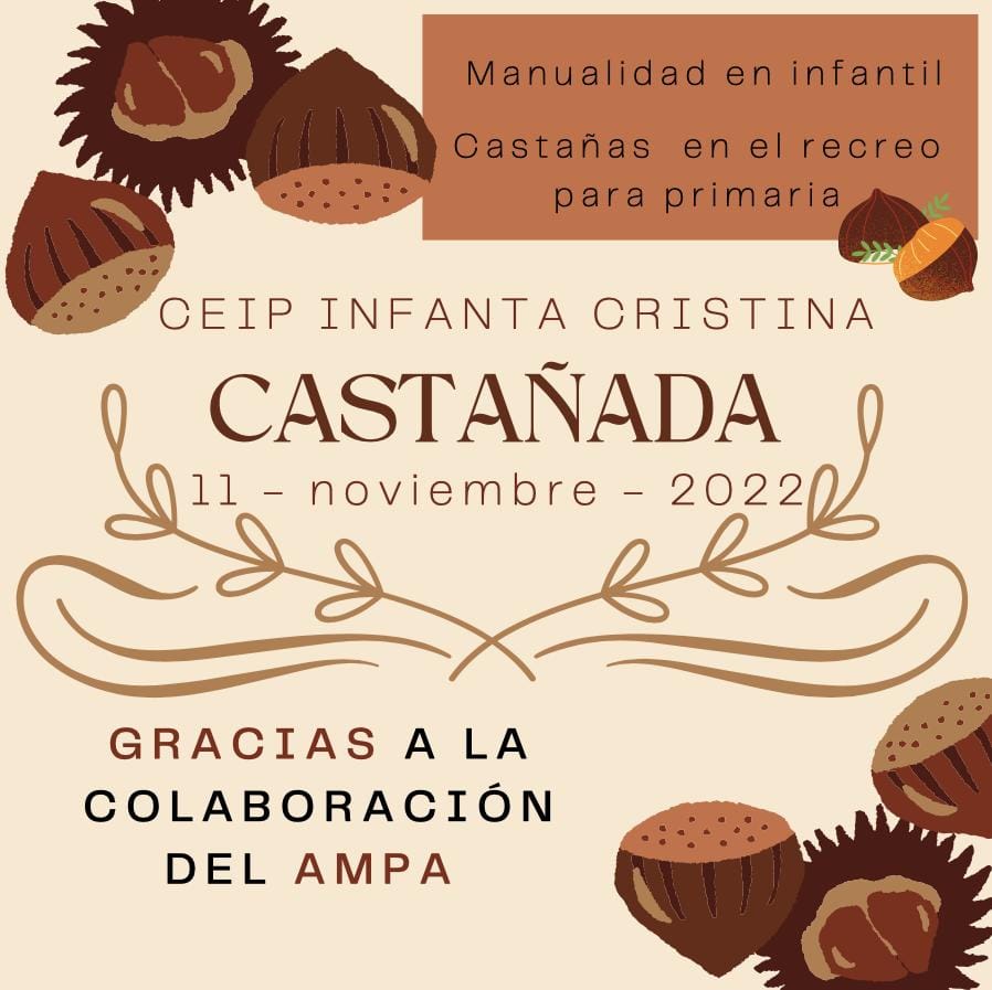 Por otro lado, para los alumnos y alumnas de primaria, en el recreo, hubo castañada oficial, donde los alumnos, con sus saludeuros, fueron comprando a sus tutores/as un vale que podían canjear posteriormente en el puesto de castañas del recreo, cuyo valor era de 5 saludeuros por un cucurucho de castañas recién asadas y buenísimas, todo con la inestimable ayuda una vez más, de los padres y madres de nuestro AMPA que siempre colaboran en todo aquello que le vamos proponiendo.