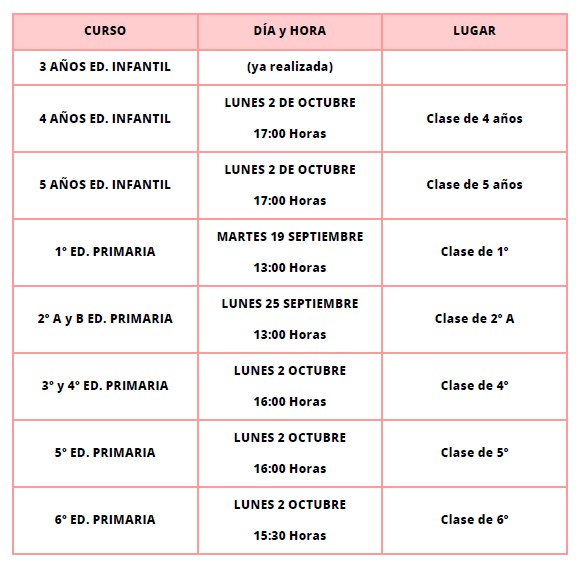 Con el siguiente calendario informamos de las reuniones de los tutores/as con las familias en el Colegio de manera presencial. Se realizarán en las aulas de referencia de cada nivel, respetando las medidas de seguridad y con la asistencia de un familiar por alumno/a. No podrá haber presencia de hijos/as.
