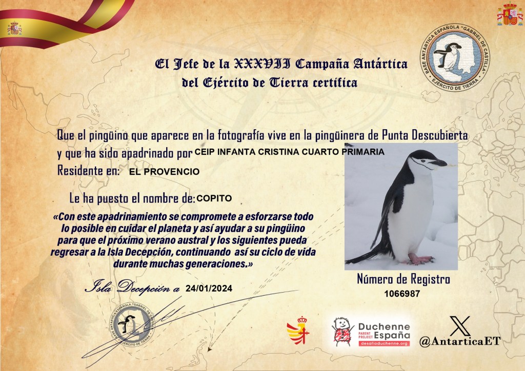 Y, por último, el alumnado de 4º a 6º recibió el diploma acreditativo por la campaña «APADRINA UN PINGÜINO», siendo Kevin, Wendy, Oreo y Copito los nombres elegidos (el resto de cursos lo realizarán a primeros de febrero).