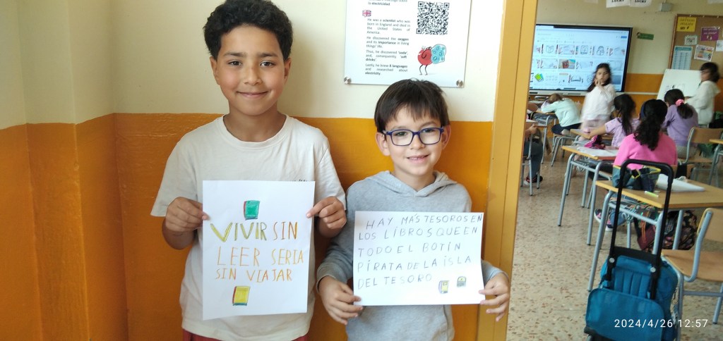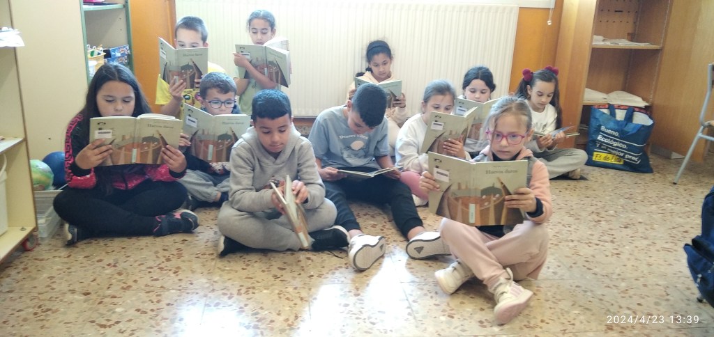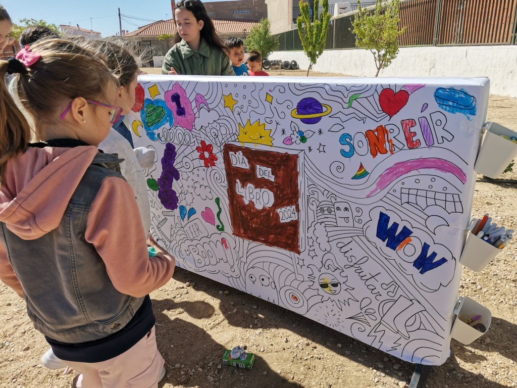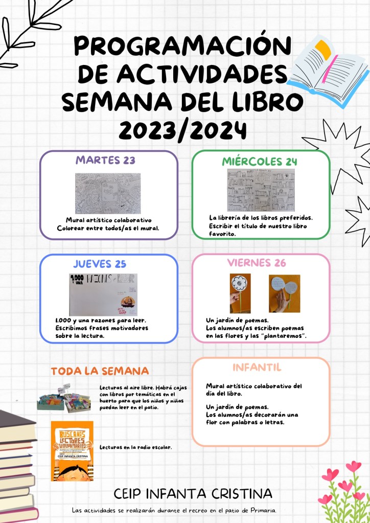 La semana del 23 de abril celebramos en el colegio el día del libro. En estos días la biblioteca se traslada al huerto y se organizaron diferentes actividades como la lectura al aire libre, decoración de murales, cuentacuentos para Infantil realizado por la bibliotecaria del pueblo Mª Carmen o la elaboración de marcapáginas y carteles de animación a la lectura entre otras.