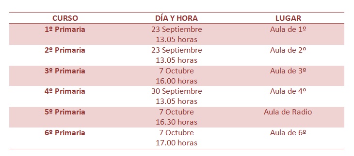 Con el siguiente calendario informamos de las reuniones de los tutores/as con las familias del alumnado de Primaria en el Colegio de manera presencial. Se realizarán en las aulas de referencia de cada nivel y con la asistencia de un familiar por alumno/a. No podrá haber presencia de hijos/as.