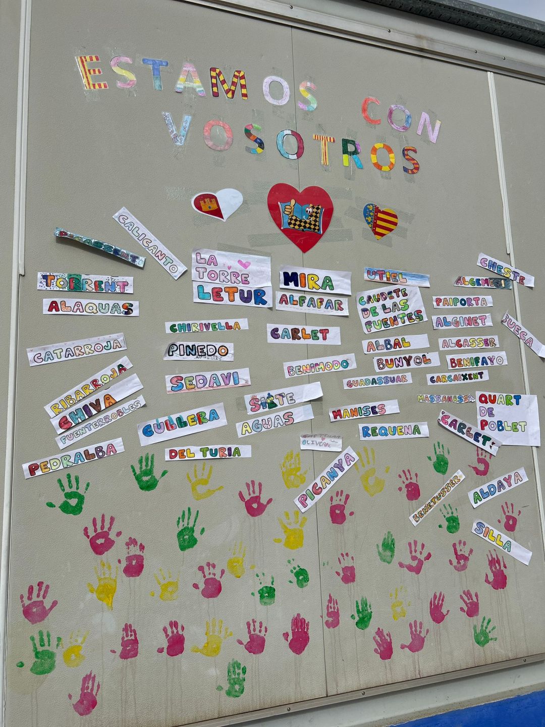 - El alumnado de 1º, 2º y 3º de primaria decoró y pegó en el mural el nombre de los pueblos afectados por la DANA; 🌇