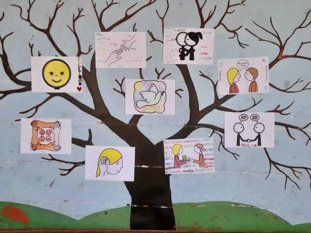 Además, como actividad de centro, entre todos los cursos hemos definido la palabra «Paz»: es abrazar, compartir, sonreír, ayudar, dialogar, escuchar, tolerar y amistad, que hemos simbolizado en nuestro mural del cole acompañado por la lectura del manifiesto elaborado por el alumnado de 6° EP.