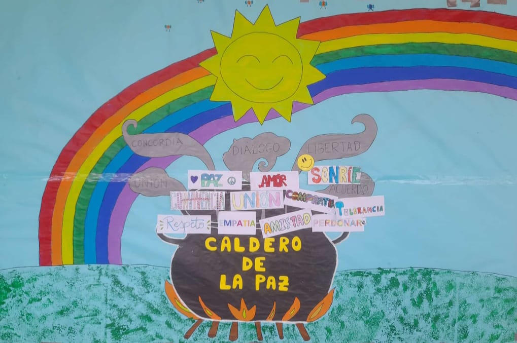 Como actividad colaborativa, se elaboró un gran mural común «El caldero de la PAZ» con palabras relacionadas con la paz, inspiradas en los cortos y las actividades realizadas, y el alumnado de sexto de Primaria puso el broche final con un baile de la canción Bajo el mismo sol, de Álvaro Soler.