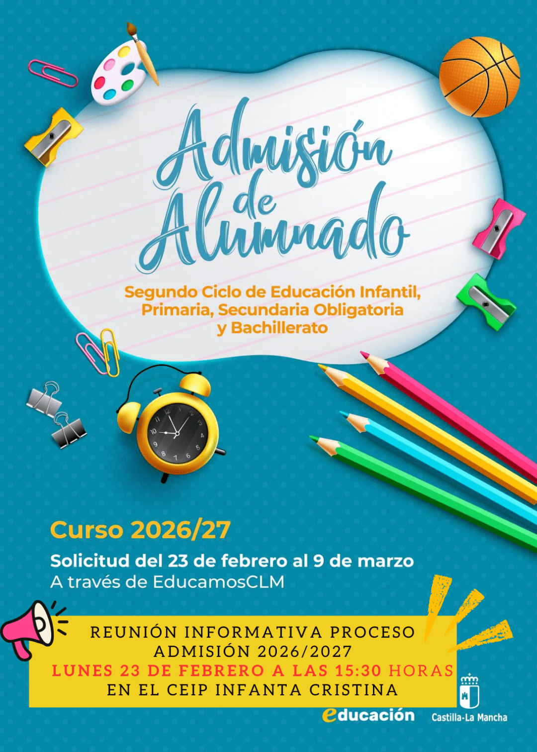 Se informa que el próximo lunes día 23 de febrero, a las 15:30 horas se celebrará una reunión en el CEIP Infanta Cristina para informar sobre el proceso de admisión del alumnado para el curso 2026/2027.