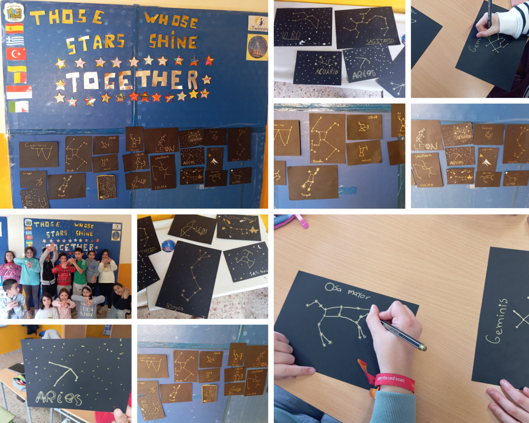 Los alumnos de 4º han realizado un trabajo de investigación y realización artística de las constelaciones. Primero, han aprendido qué es una constelación y después han decidido trabajar solos o en parejas para plasmar una constelación en una cartulina y buscar información sobre ella en inglés y en español, para después contar a sus compañeros de la misma clase e incluso de otros cursos, la información obtenida.
